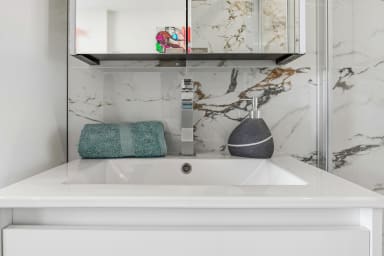 Das Badezimmer verfügt über eine elegante italienische Dusche mit modernen Oberflächen in Marmoroptik.
