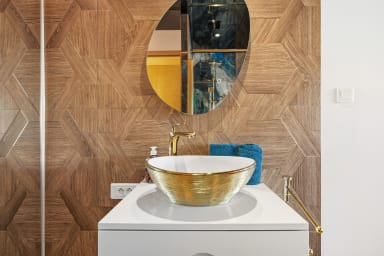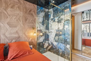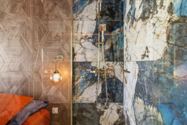Mur effet marbre bleu profond, bois texturé, finitions dorées, vasque gold, éclairages chaleureux et miroir plafond.