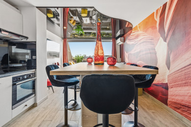 La cuisine moderne s’intègre parfaitement à la pièce de vie et offre un espace pratique pour cuisiner sur place. L’appartement dispose également d’un bel espace repas, convivial et fonctionnel.