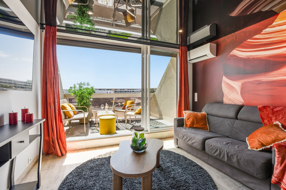 Le séjour est lumineux et agréable, avec une grande baie vitrée qui ouvre directement sur la terrasse. La hauteur sous plafond et la décoration contemporaine donnent beaucoup de caractère à l’ensemble.