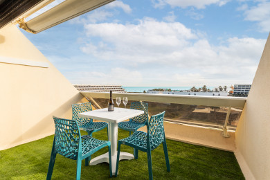 Ampia terrazza panoramica con mobili da giardino, esposta a sud/sud-est. Vista libera sul mare, sul porto e sui giardini di Héliopolis.