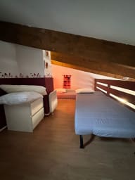 Une mezzanine mansardée avec deux lits simples, idéale pour des enfants