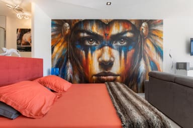 Монументальная настенная фреска придает интерьеру мощную художественную идентичность и создает эффект полного погружения.